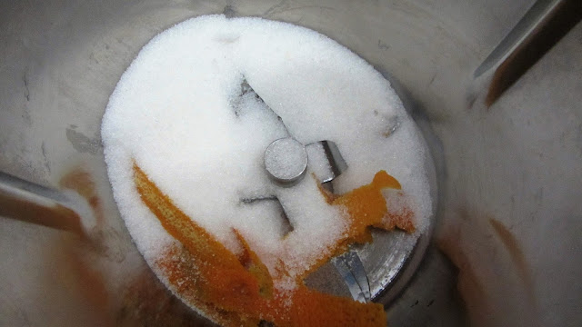 Colocamos na Bimby o açúcar e a casca da laranja e programamos 15 segundos velocidade 5-7-10, caso não esteja bem triturado repetimos este passo.
