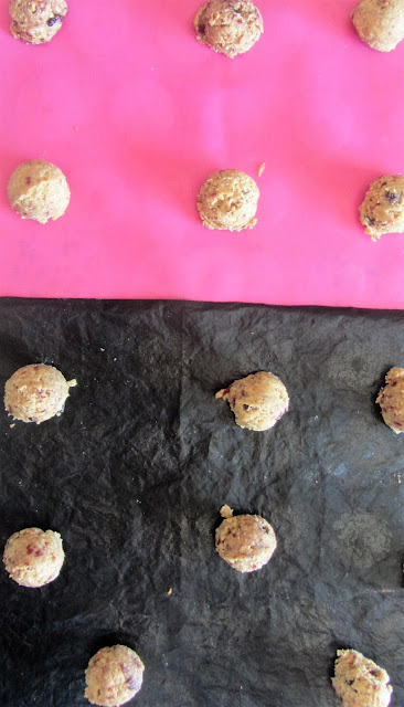Ligamos o forno nos 180ºC a pré-aquecer. Entretanto fazemos bolinhas, aproximadamente do tamanho de bolas de golf, ou deitamos colheradas com a ajuda duma colher de bolas de gelado.
