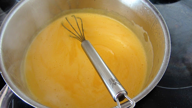 Passamos as gemas por um passador de rede e envolvemos a calda aos poucos e misturamos. Retiramos o pau de canela e a casca de laranja e levamos de novo ao lume, brando, mexendo sempre até engrossar. Retiramos e deixamos que arrefeça. Guardamos no frigorífico até usar.
