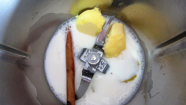 Colocamos no copo a água, o leite, a manteiga, o sal, a casca de limão e o pau de canela e programamos 7 minutos, 100 ºC, velocidade 1.