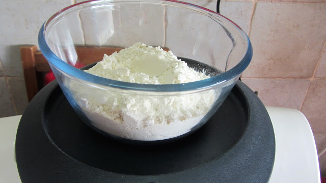 Pesamos a farinha. Juntamos o fermento e reservamos.