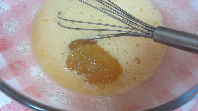 Batemos os ovos com o açúcar para que se misturem. Juntamos o doce e misturamos para envolver bem.