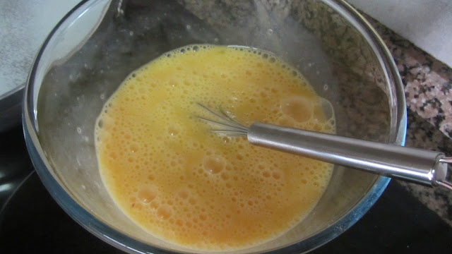 Transfere-se para uma frigideira que possa ir ao forno e acrescentam-se os ovos batidos com um pouco (pouco no meu caso pois tudo tinha sal) de sal e pimenta.