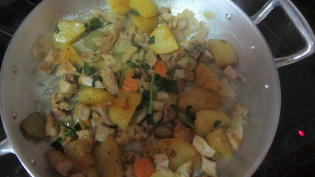 Numa frigideira coloca-se um pouco do molho da carne e salteiam-se as batatas (cortadas em pedaços). Acrescenta-se a carne em pedaços. Salpica-se com coentros e com os pickles.