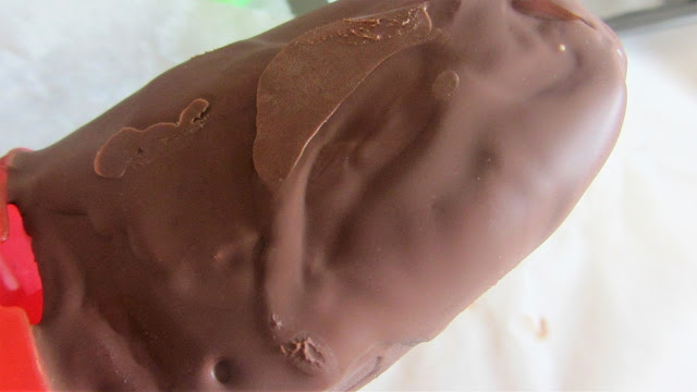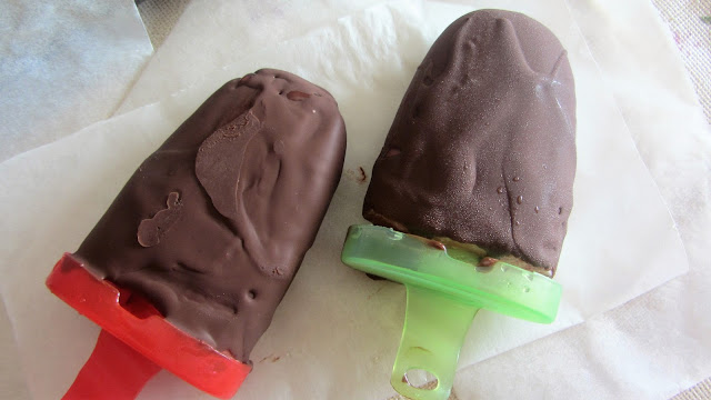 Entretanto derretemos o chocolate e enquanto estiver quente, com a ajuda de uma colher cobrimos os gelados. Forma logo uma crosta devido à diferença de temperaturas. Levamos novamente ao congelador até ser hora de comer estes miminhos em forma de gelado.