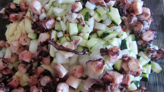 Começamos por cozer o polvo na panela de pressão: Colocamos o polvo congelado na panela de pressão, o vinho tinto, a cebola, o alho e tapamos. Quando a pressão começar contamos 30 minutos. Este tempo varia com o tamanho do polvo, mas até 1 kg penso ser o suficiente. Depois de cozido deixamos arrefecer e cortamos. Pode juntar-se aqui um pouco de sal e pimenta, visto que o polvo vai a cozer sem tempero nenhum.