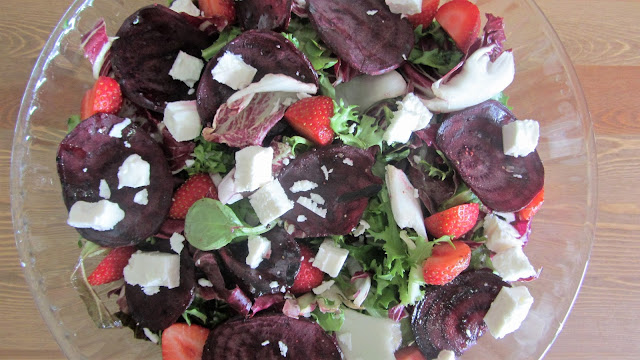 Numa taça colocamos a alface (ou a mistura), dispomos a beterraba grelhada os morangos e salpicamos com o queijo feta. Vai ao frigorífico até servir. Nesse momento temperamos com molho de iogurte. Experimentem! :)