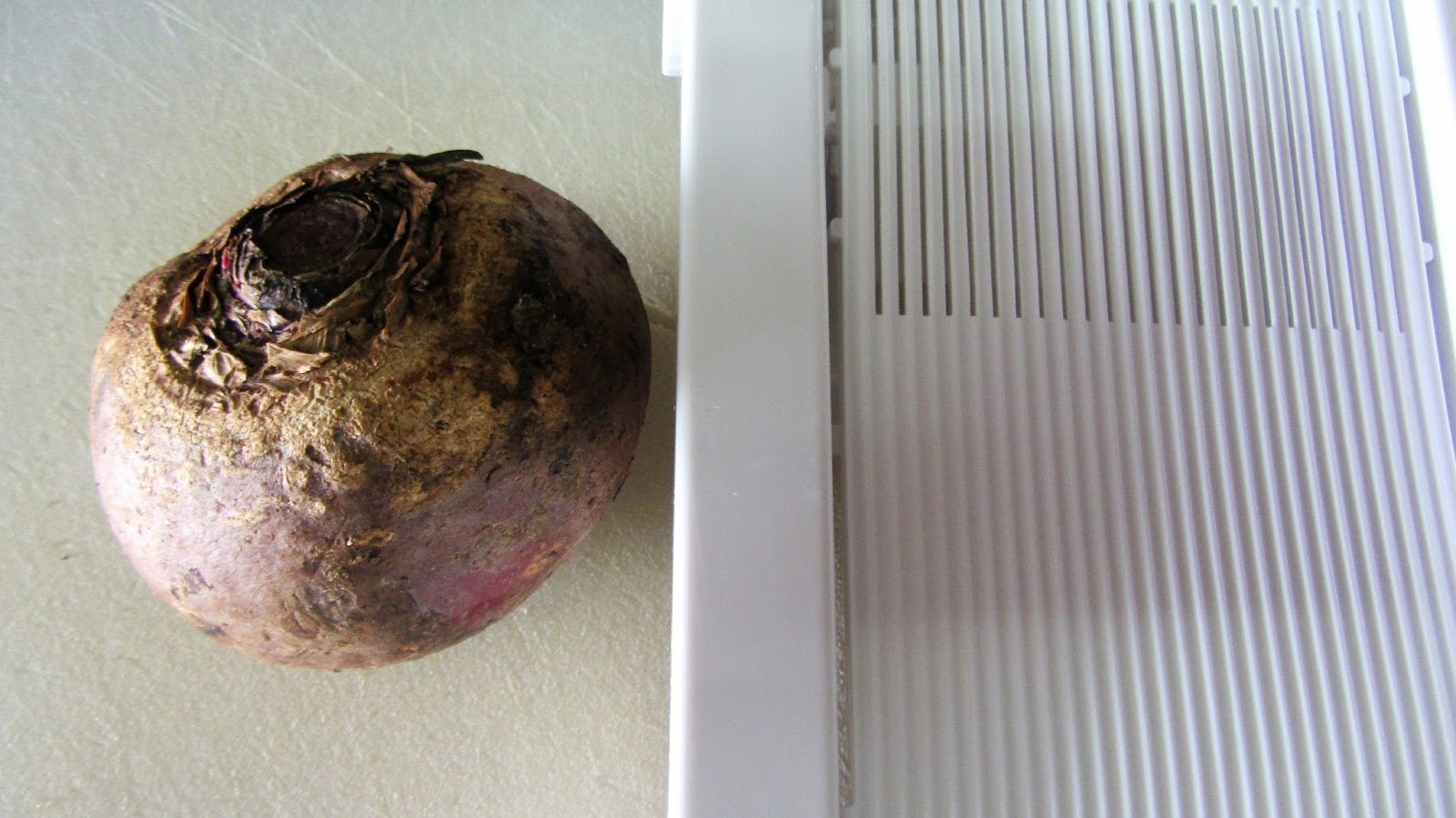 Descascamos a beterraba e com a ajuda duma mandolina cortamos em fatias finas. Temperamos a gosto com sal e pimenta e grelhamos por uns minutos (é rápido).