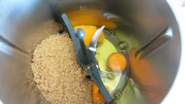 Com a borboleta no copo juntar os ovos e o açúcar e programar 4 minutos, 37 ºC, velocidade 4 e depois mais 4 minutos velocidade 4. Retirar a borboleta.