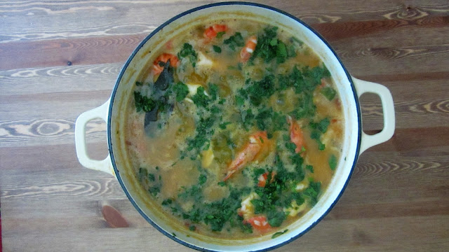 Este é o tipo de refeição para fazer e comer logo, enquanto o arroz tem caldo, podem também usar picante, malaguetas por exemplo, mas aqui em caso gostamos mais sem picante.