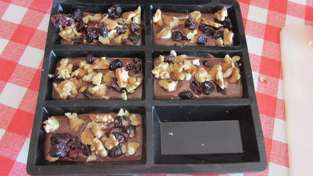 Derretemos os chocolates em banho maria. Picamos os arandos e as nozes ou caso façam com as avelãs deverão retirar-lhes a pele, colocando-as para isso num tabuleiro, no forno a 180 ºC durante uns minutos.