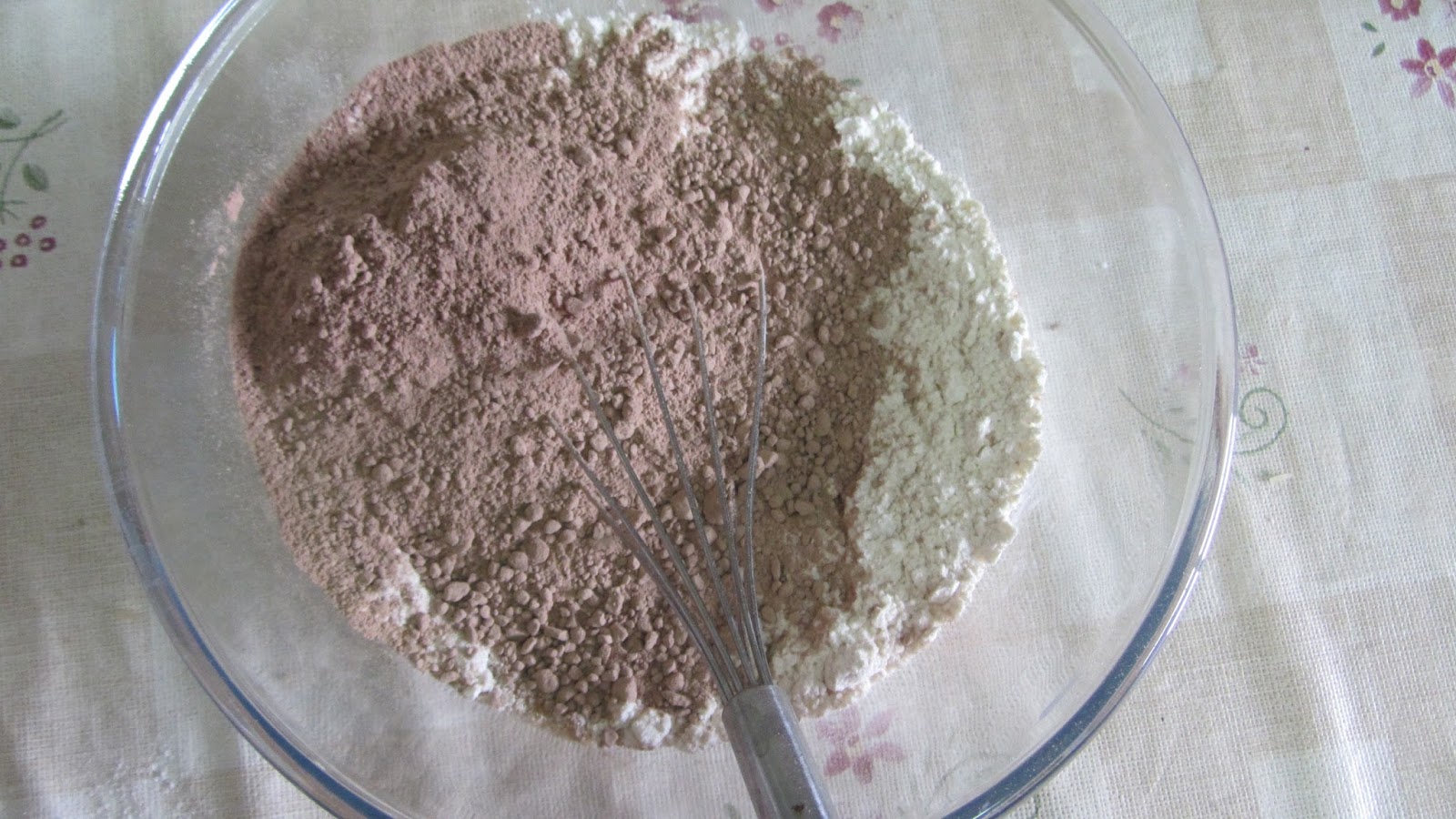 Paramos de bater, peneiramos o cacau, juntamos o vinagre e o chocolate em pedaços e envolvemos.